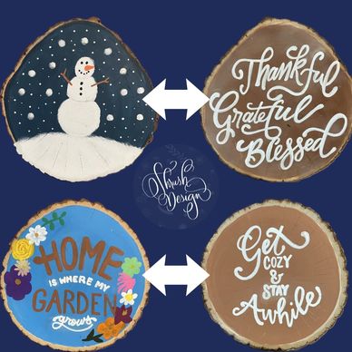 These thick wood chunk signs are hand-painted and two-sided and can lean against a wall or other vertical surface.