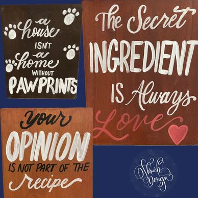 These medium-sized wood signs are hand-painted. They have a ledge on the back on which they can be hung easily, or you can easily add whatever type of hanger you would like to the back. The signs can also stand on a shelf or lean on wall or other vertical surface.