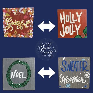 These small-sized wood signs are two-sided and hand-painted. The signs can stand on a shelf or lean on wall or other vertical surface.